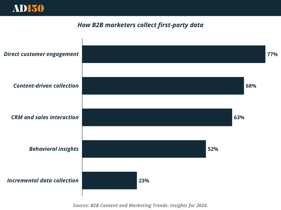 Right behind it, 68% rely on content-driven collection — gated assets, webinars, and interactive tools that let buyers self-qualify while trading value for insight. And 63% are tapping CRM and sales interactions, turning service conversations and rep notes into structured intelligence.